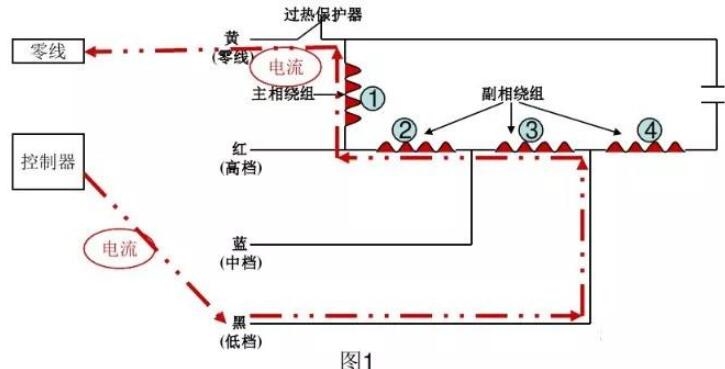 電(diàn)機正常(cháng)接線時(shi)電流圖(tú),以低檔(dang)通電運(yun)行爲例(li)。