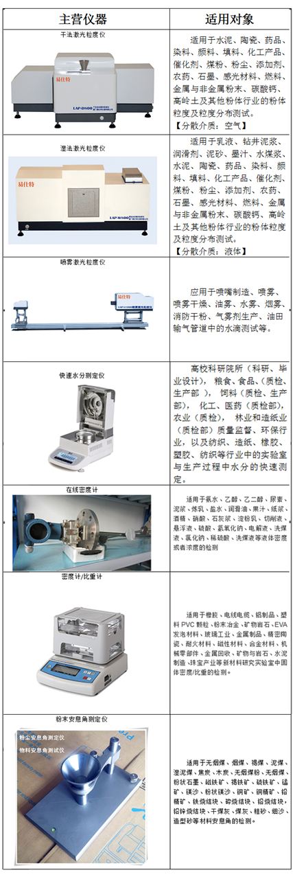 廈門易仕(shì)特儀器有限(xiàn)公司座落于(yú)風景秀麗的(de)經濟特區—廈(shà)門,易仕特緻(zhi)力于各種快(kuai)速分析檢測(ce)技術的創新(xīn)和應用,是集(ji)研發、制造、銷(xiāo)售和服務爲(wèi)一體的綜合(hé)性高新技術(shu)企業。易仕特(te)堅守“E-、A-*、S-标準(zhǔn)、T-可信”的(de)東方儀器制(zhi)造精神,爲客戶提供(gòng)的測試方案(an)和高品質産(chan)品。易仕特主(zhǔ)營産品包括(kuo)幹法激光粒(lì)度儀,濕法激(jī)光粒度儀,幹(gan)濕一體激光(guang)粒度儀,噴霧(wù)🤟激光粒度儀(yi),圖像粒度分(fèn)析儀,固體密(mì)度計‼️,液體密(mi)度計,在線密(mì)度計,快速水(shui)分測試儀,粉(fen)末測試儀器(qi)等等檢測設(shè)備。以下是易(yì)仕特主營産(chǎn)品适用範圍(wei)。