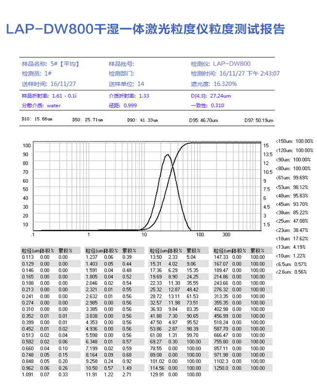 顯示模闆(pǎn) | 粒徑(jing)區間求百(bǎi)分比,以滿(man)足不同行(háng)業對粒度(du)測試🔞的🔅表(biǎo)♉征方式🤞。徑(jing)距、一緻性(xing)、區間累積(ji)等等 |