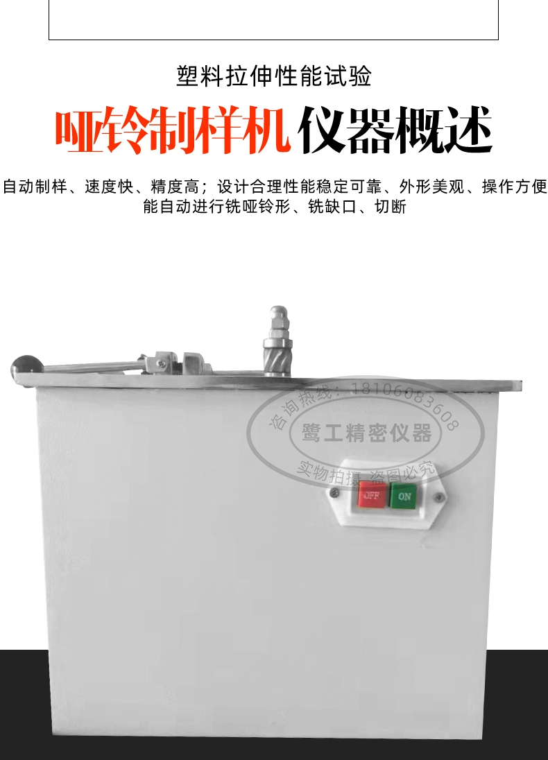 啞鈴型制(zhì)樣機采用機械(xie)加工手段,是制(zhi)備各種非金屬(shu)材料做拉🌈伸試(shì)驗🙇🏻用🈲标準啞鈴(ling)型試樣的專用(yong)設備.該機制備(bèi)🤟的試樣符合GB/T1040-92