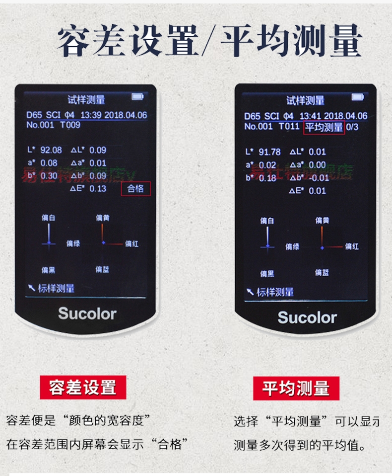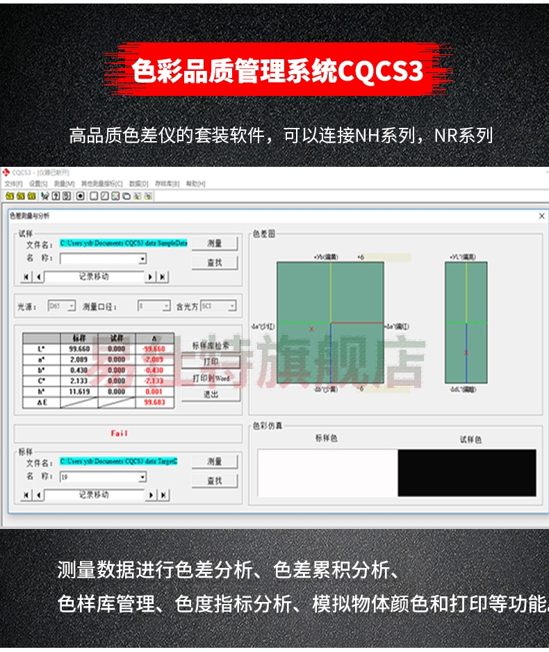 1、自動比較(jiao)樣闆與被檢品(pin)之間的顔色差(chà)異,輸出CIE_Lab三組數(shu)據🚶和比色後的(de)△E、△L、△a、△b四組色差數據(jù),提供配色的參(can)🔆考方💞案。